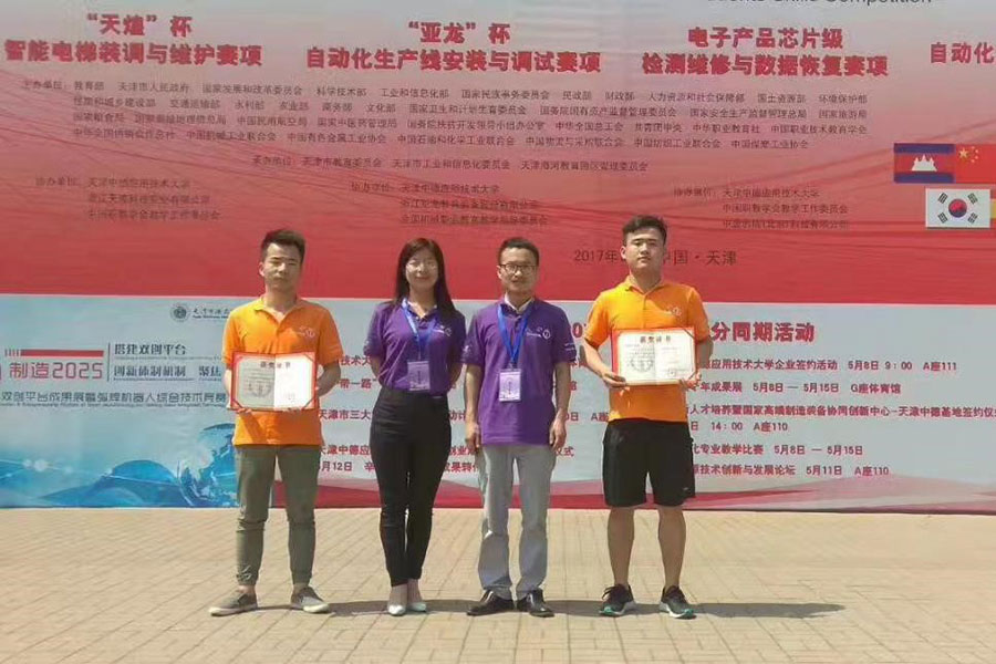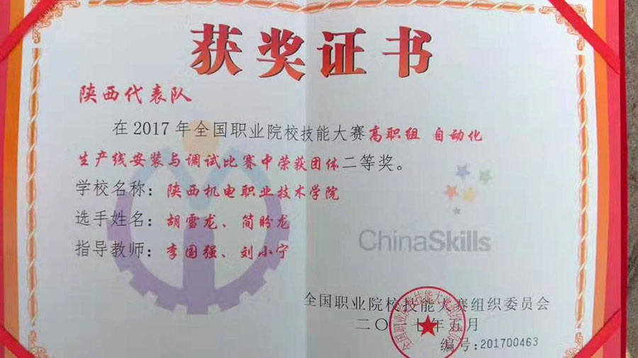 近日2017年全国职业院校技能大赛总决赛在天津主赛区落下帷幕,我院13机电高职2班胡雪龙、简盼龙两位同学在机电工程系李国强、高白川、刘小宁三位老师的精心指导下,首次代表陕西省参加自动化生产线安装与调试(高职组)项目,以出色的表现和精湛的技艺,荣获团体二等奖,充分展示了我院学生良好的动手实践及团队协作能力。