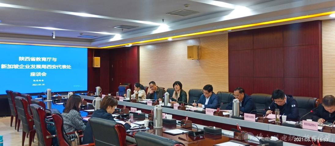 2021年3月18日下午,陕西省教育厅与新加坡企业发展局西安代表处座谈会在西安召开,出席此次座谈会的有陕西省教育厅副厅长刘宝平,新加坡企业发展局西安代表处主任袁颖,陕西省教育厅职成处、装备中心、外事处有关处室负责人以及省内部分高职院校代表。陕西机电职业技术学院党委副书记、院长向纪明、国际合作交流处长罗亚军参加了座谈。