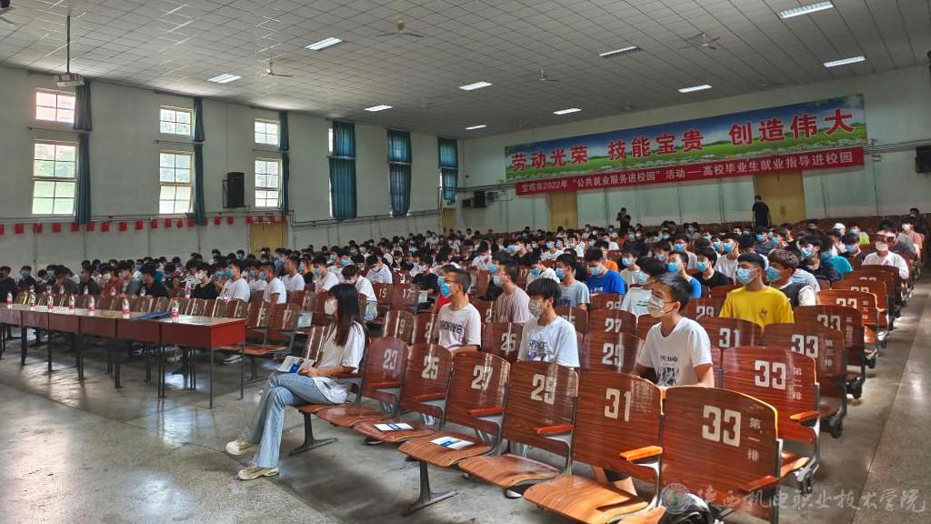 2022年5月24日,宝鸡市“公共就业服务进校园”系列活动在学校宝福路校区大礼堂成功举办。宝鸡市公共就业和人才服务中心主任张军仓、学校招生就业处副处长田正本及学校宝福路校区近400余师生参加活动。此次活动由宝鸡市人力资源和社会保障局与我校联合主办,宝鸡市公共就业和人才服务中心、招生就业处承办,活动由张军仓主持。