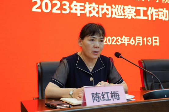 2023年校内巡察组组长、党委副书记、纪委书记陈红梅对本次巡察工作进行具体安排部署。她指出,本次巡察是新形势下贯彻落实党中央全面从严治党向基层延伸的重大举措和重要抓手,是党内的“政治体检”、作风的“专项会诊”、精神的“集中补钙”和思想的“深刻警醒”。她强调,巡察组将深刻领会习近平总书记关于巡视工作的重要论述,按照政治巡察要求,以问题为导向,以党章党规党纪为尺子,通过业务看政治,通过问题看责任,发挥巡察的震慑遏制治本作用。并要求巡察组成员一要提高政治站位,统一思想认识,深刻领会开展校内巡察的重要意义;二要坚持问题导向,突出政治巡察,精准把握巡察工作的具体要求;三要压实政治责任,强化政治担当,坚决完成党委交办的任务。