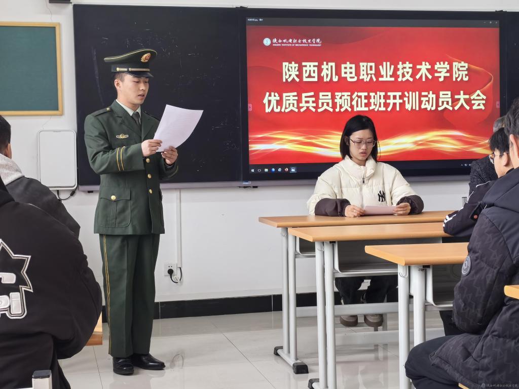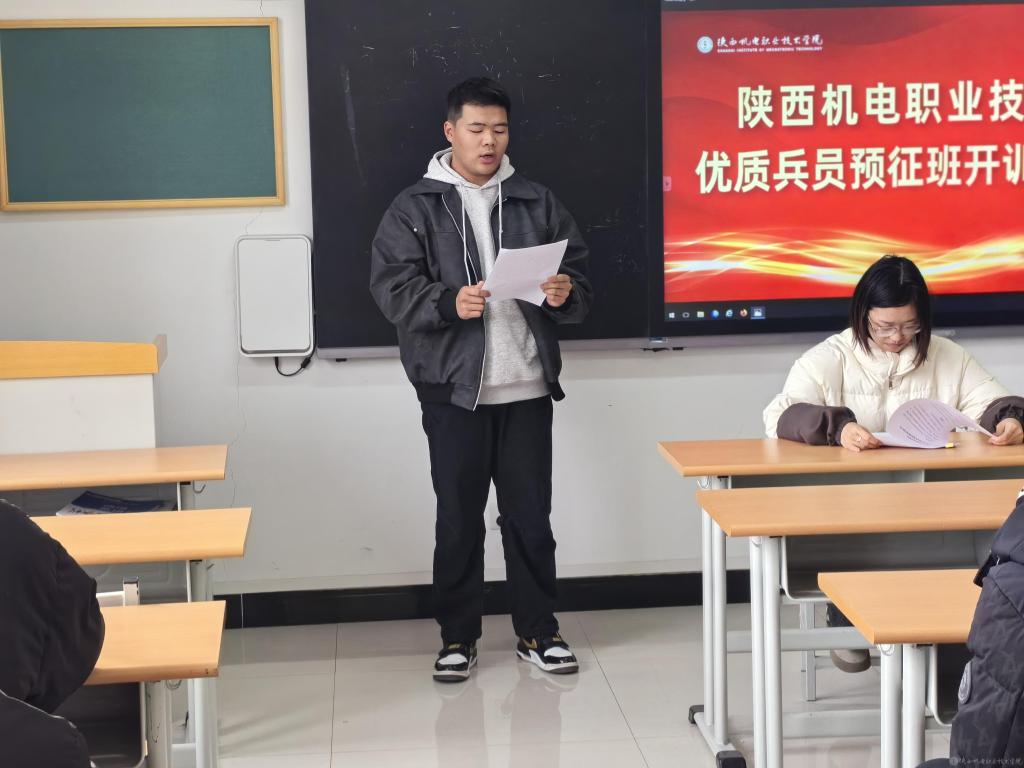 人武部干事安童老师宣读了《陕西机电职业技术学院优质兵员储备基地预征班2024年度训练计划》,明确了训练要求。预征班学员代表电子信息学院22现代信班屈杨帆、承训退役士兵代表智能制造学院23机电技术1班李阳分别作了表态发言。