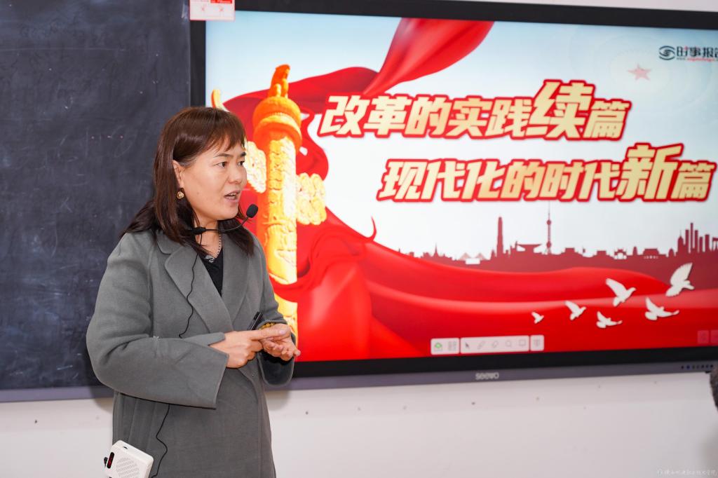 课堂上,陈红梅向同学们深入解读了《中共中央关于进一步全面深化改革、推进中国式现代化的决定》,深刻剖析了党的二十届三中全会“一大目标”“两大任务”“七大聚焦”“六大原则”“十四大系统部署”“一个特别强调”,讲述了以改革开放推动党和国家各项事业取得历史性成就、发生历史性变革的新局面,与同学们积极互动,课堂气氛活跃。