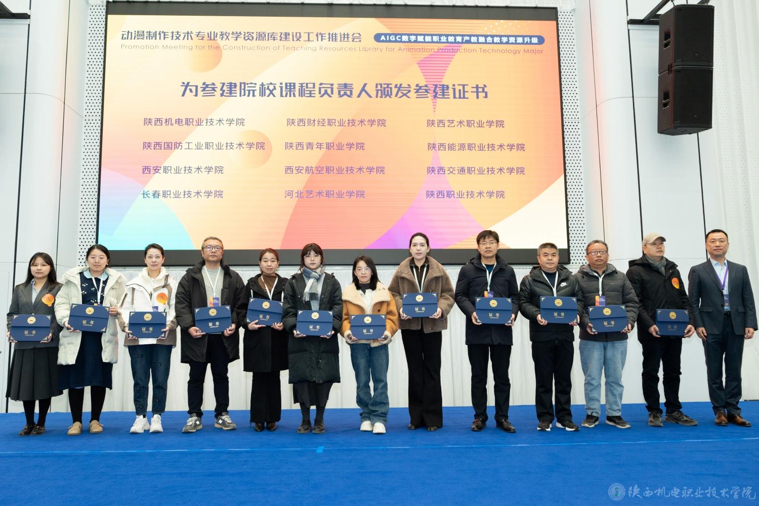 为快速提升我校动漫制作技术及相关专业建设水平,推动专业课程体系和教学模式创新改革,12月22日,动漫制作技术专业教学资源库建设任务推进会在西安举办,我校作为参建单位受邀参加会议。此次推进会由陕西职业技术学院主办,来自全国各地的知名企业代表、行业专家、职业院校代表齐聚一堂,共同探讨“新双高”标准要求下的AIGC数字内容产业数字化资源建设。我校党委委员、副院长张克带队参会并主持专题分享环节,同时为参建院校课程负责人颁发参建证书。