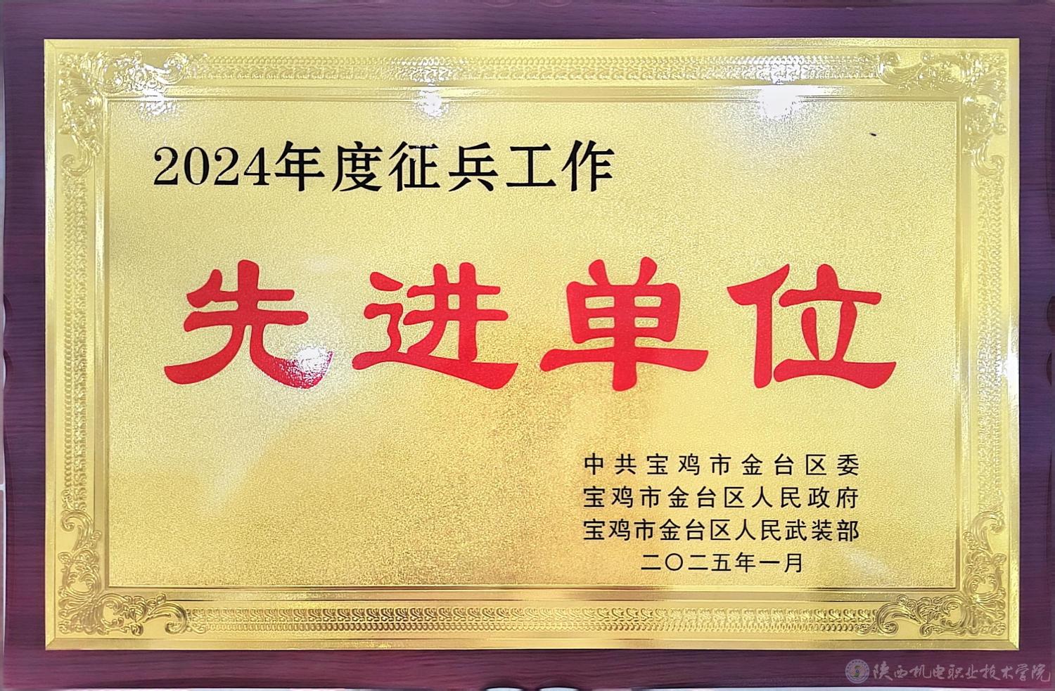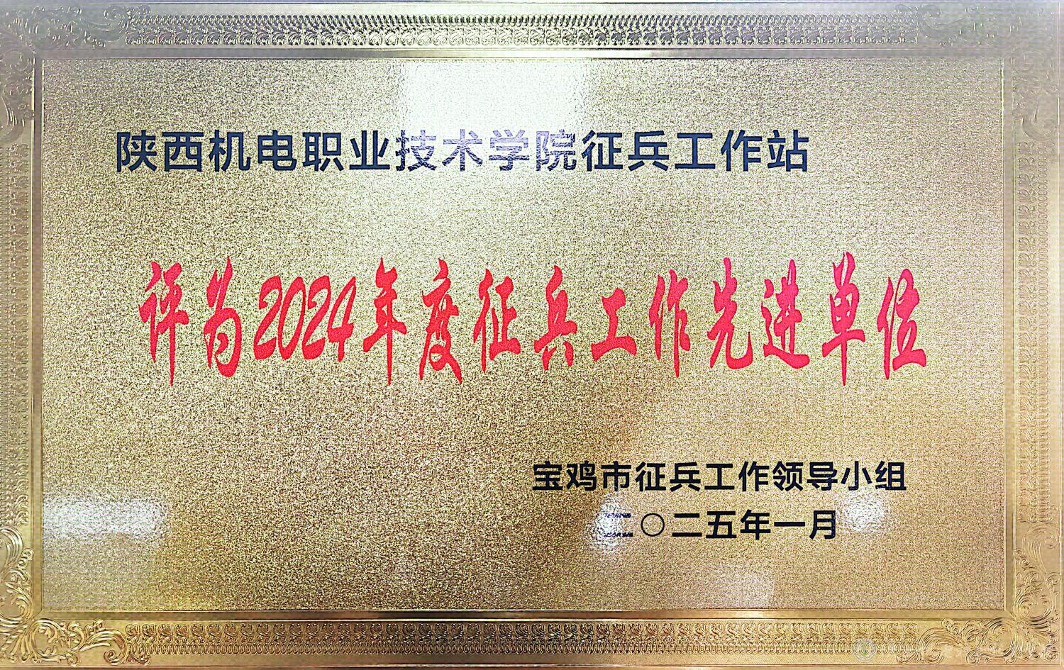 近日,陕西机电职业技术学院被宝鸡市征兵工作领导小组,中共宝鸡市金台区委、金台区人民政府、金台区人民武装部评为“2024年度征兵工作先进单位”。此次奖项是我校第二次同时荣获宝鸡市和金台区两级“征兵工作先进单位”称号。