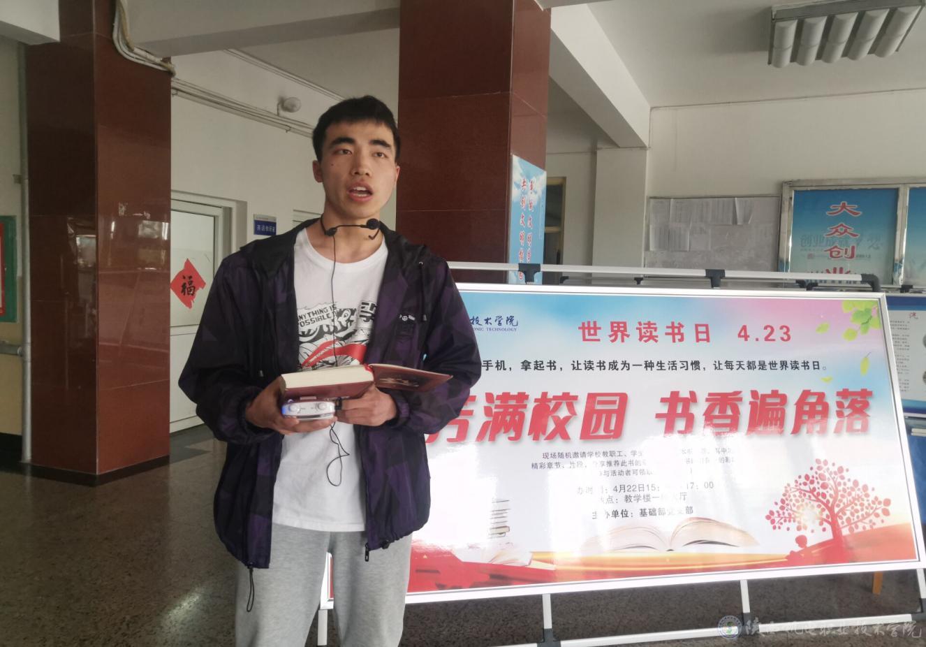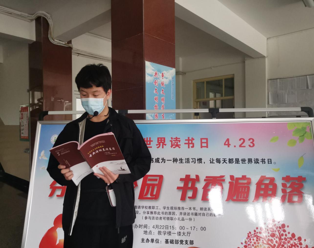 下午三点宝福路校区第一教学楼大厅,同学们带着自己喜欢的书籍来到现场有序参加活动,随着基础部党支部书记满春燕的宣布,活动正式开始。党支部成员严把疫情关,严查佩戴口罩,保持一米距离。同学们介绍书的主要内容并阐述推荐理由,还把特别喜欢的章节或者段落朗读给在场的每一个人听,声情并茂,颇具感染力。